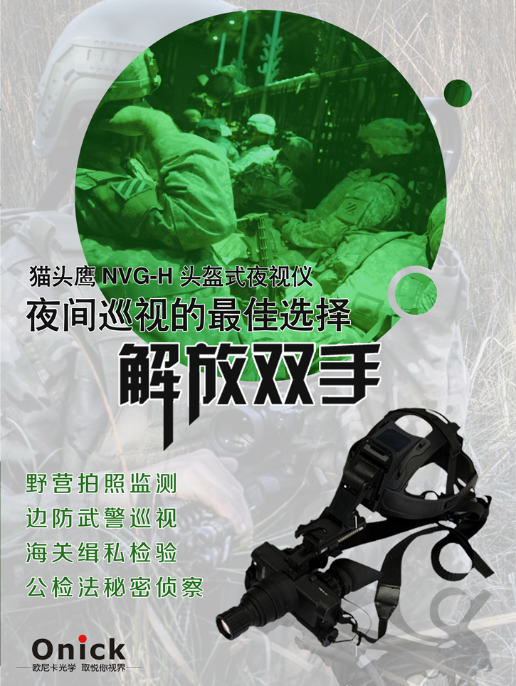 歐尼卡onick NVG-H超二代1倍是一種單物雙目頭盔式夜間巡邏專用微光夜視儀。體積小,重量輕,自動亮度控制,配備軍用合格測試的頭盔佩戴,其所采用美國技術的高級像增強器和先進的光學系統,高分辨率,具有防強光和防眩目功能,單管夜視鏡圍繞高品位18毫米HPT圖像增強管,為觀察方便并采用偽雙目設計,內置紅外輔助照明光源。多用途:手持式,頭戴式